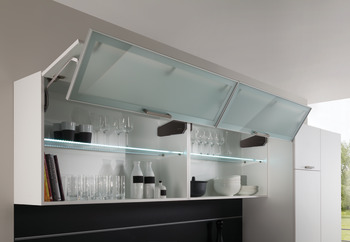 - Cơ chế Free Fold gập đôi tiện lợi: Cánh tủ mở theo dạng gập đôi và nâng lên phía trên, giúp tiết kiệm không gian phía trước, đặc biệt phù hợp cho các hệ tủ treo cao.