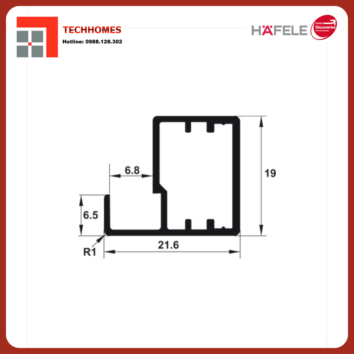 Khung kính nhôm, Thanh N01, 19 x 21,6 mm, 6.5 mm lộ ra, để cố định kính với miếng đệm trong suốt 563.58.303