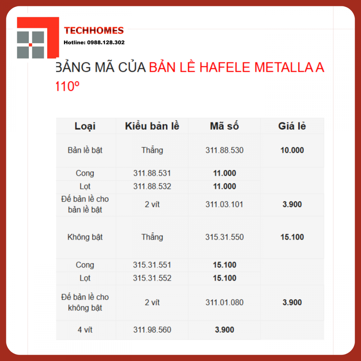 Việc lắp ráp, sửa chữa và bảo dưỡng BẢN LỀ HAFELE đúng cách không chỉ giúp sản phẩm hoạt động ổn định mà còn kéo dài tuổi thọ của nó. Hãy để Techhomes Việt Nam đồng hành cùng bạn trong mọi nhu cầu về phụ kiện nội thất HAFELE. Liên hệ ngay hôm nay để được hỗ trợ nhanh chóng và tận tâm!