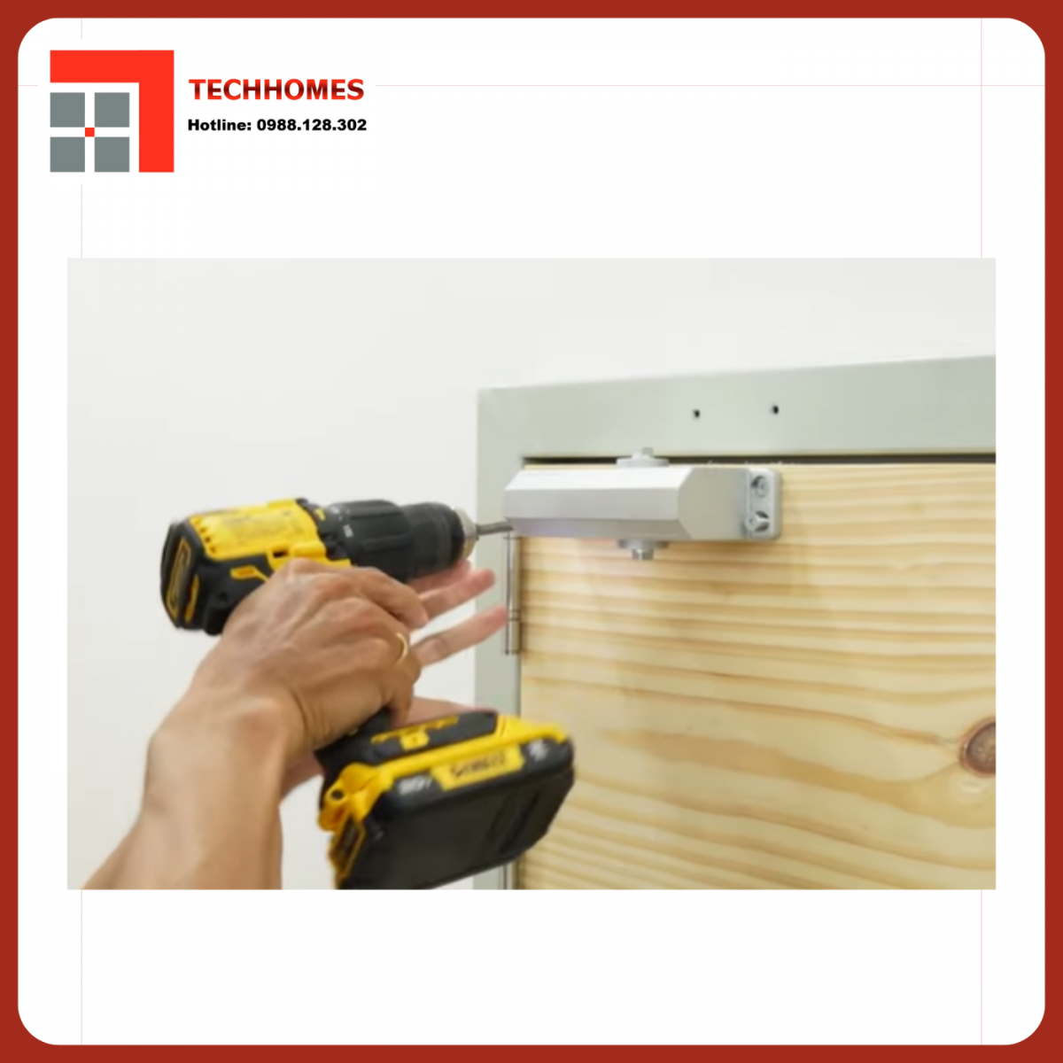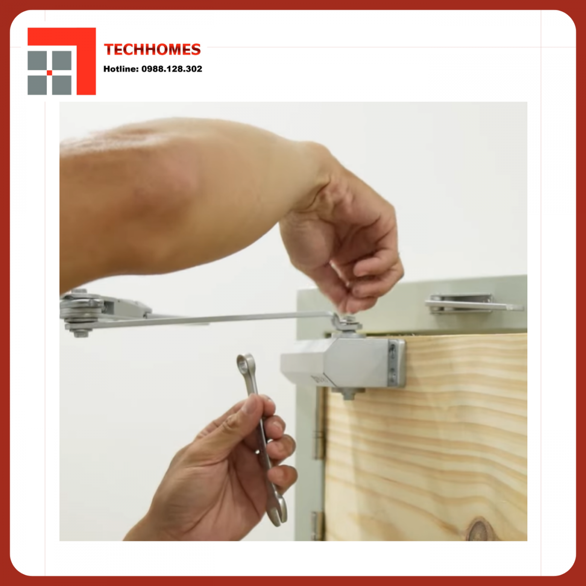 Gắn cánh tay đòn vào trục thân tay co, sau đó nối với phần đế đã bắt trên khung. Điều chỉnh độ dài tay di động sao cho khi cửa đóng, tay di động tạo một góc 90 độ với mặt cửa.