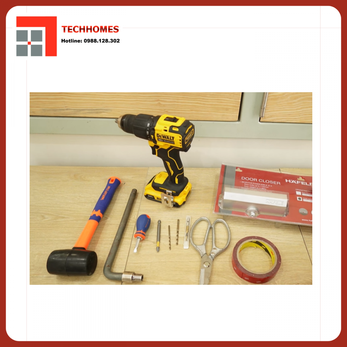 - Bộ sản phẩm tay co Hafele, máy khoan, mũi khoan (4.2mm cho cửa nhôm/sắt hoặc 2.5mm - 4mm cho cửa gỗ), tua vít, thước kéo, bút chì và băng dính.