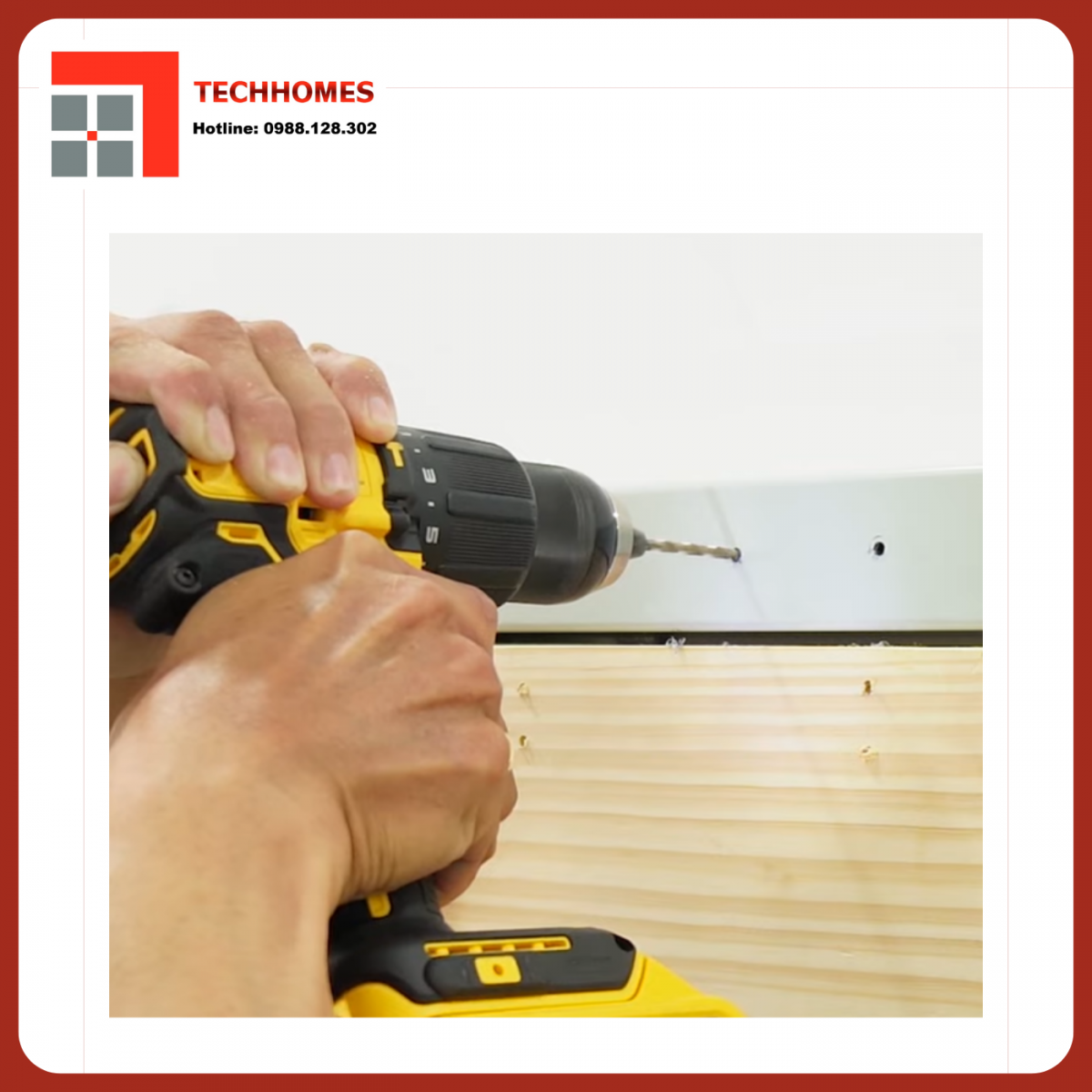 - Dùng khoan tạo lỗ nhỏ tại các vị trí đã đánh dấu (tránh làm nứt gỗ hoặc biến dạng nhôm cao cấp).