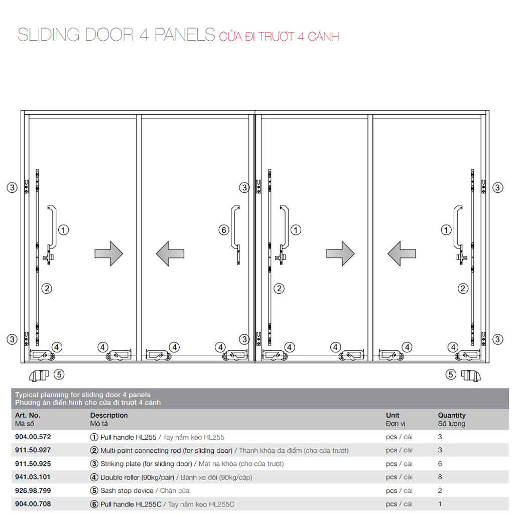 BẢNG MÃ CỦA PHỤ KIỆN CỬA TRƯỢT NHÔM KÍNH HAFELE 4 CÁNH