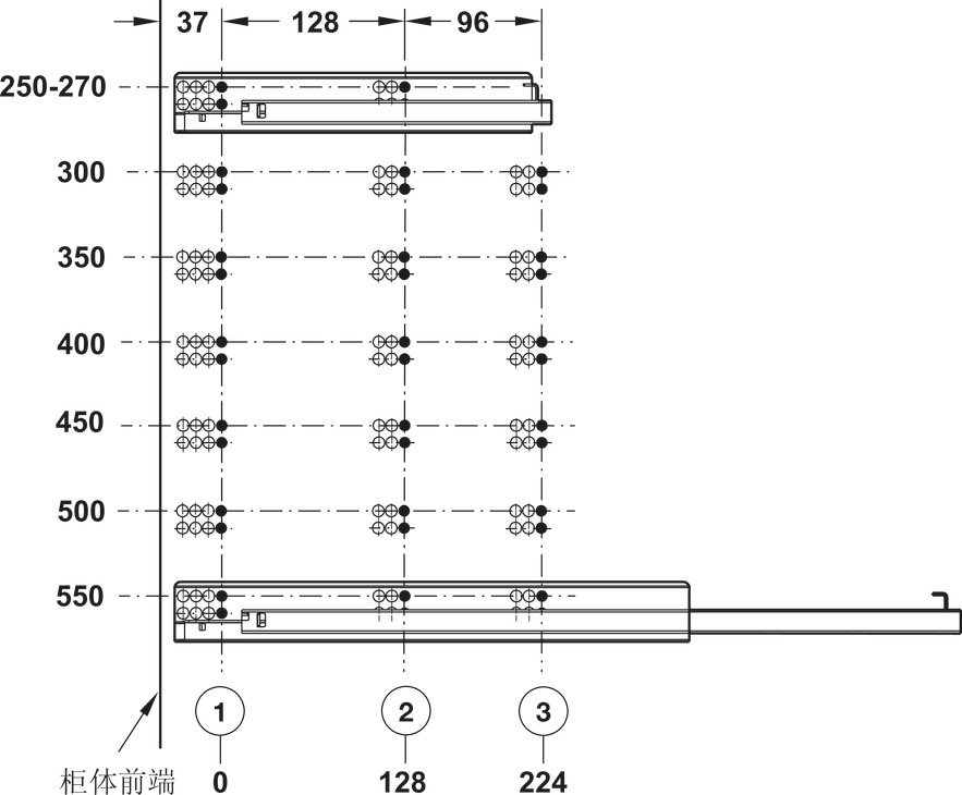 - Chiều dài ngăn kéo: 250 mm Cơ chế giảm chấn và tự đóng